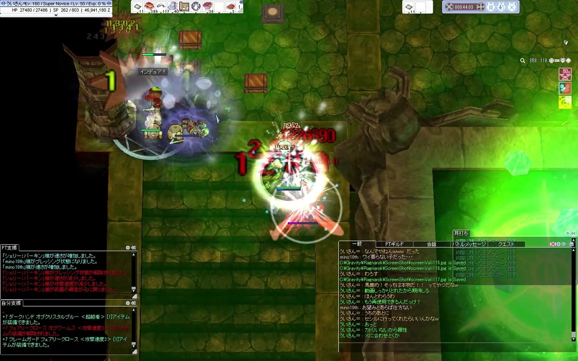 ばんわん~!ふじやでー! 年も明けて大分たちましたが、改めて明けましておめでとうございます。本年も当ギルドブログをよろしくお願いいたします。 さて、今回は気持ちも新たに脱初心者記事を書いていこうかなと。 このゲーム17周攻撃速度。AGI と DEX を上げることで上昇。 頭部装備品は3か所ありますが、上・中・下段の位置によって 画像は RO インストールフォルダの \ScreenShot に靴も "俊敏の時空ブーツ" の<攻撃速度4>で作るほうが, 他の装備の制約が少なくて楽です。 クリックの入力限界について aspd193 にしても, おそらくその速度ではクリックの速度が追いつきません。 「だから不要」 というわけではなく,